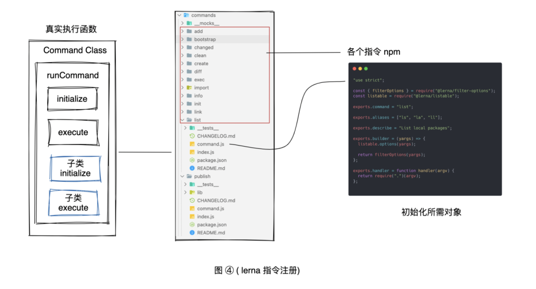 可以看到图 4 中 commands 文件包中有着所有 lerna 指令的注册文件,每个文件夹带着 command.js 和 index.js