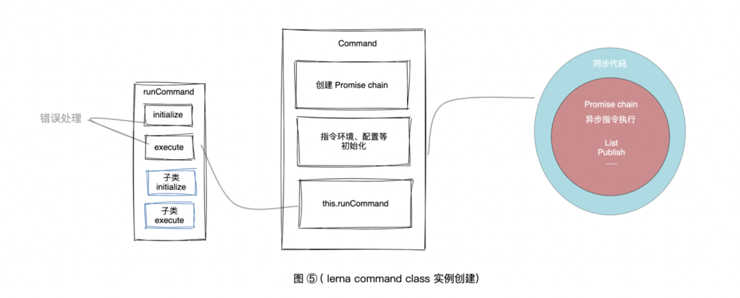 const { Project } = require("@lerna/project");// 省略大部分容错 和 logclass Command { constructor(_argv) { const argv = cloneDeep(_argv); // "FooCommand" => "foo" this.name = this.constructor.name.replace(/Command$/, "").toLowerCase(); // composed commands are called from other commands, like publish -> version this.composed = typeof argv.composed === "string" && argv.composed !== this.name; // launch the command let runner = new Promise((resolve, reject) => { // run everything inside a Promise chain // 异步链 let chain = Promise.resolve(); chain = chain.then(() => { this.project = new Project(argv.cwd); }); // 配置、环境初始化等 chain = chain.then(() => this.configureEnvironment()); chain = chain.then(() => this.configureOptions()); chain = chain.then(() => this.configureProperties()); chain = chain.then(() => this.configureLogging()); chain = chain.then(() => this.runValidations()); chain = chain.then(() => this.runPreparations()); // 最终执行逻辑 chain = chain.then(() => this.runCommand()); chain.then( (result) => { warnIfHanging(); resolve(result); }, (err) => { if (err.pkg) { // Cleanly log specific package error details logPackageError(err, this.options.stream); } else if (err.name !== "ValidationError") { // npmlog does some funny stuff to the stack by default, // so pass it directly to avoid duplication. log.error("", cleanStack(err, this.constructor.name)); } // ValidationError does not trigger a log dump, nor do external package errors if (err.name !== "ValidationError" && !err.pkg) { writeLogFile(this.project.rootPath); } warnIfHanging(); // error code is handled by cli.fail() reject(err); } ); }); // ...省略部分代码 } runCommand() { return Promise.resolve() // 命令初始化 .then(() => this.initialize()) .then((proceed) => { if (proceed !== false) { // 指令执行 return this.execute(); } // early exits set their own exitCode (if non-zero) }); } // 子类不存在 时 抛出错误 initialize() { throw new ValidationError(this.name, "initialize() needs to be implemented."); } execute() { throw new ValidationError(this.name, "execute() needs to be implemented."); }}module.exports.Command = Command;在 Class 中最关心的就是 constructor 的逻辑 ,如图 5 和代码。上面写到,每个子指令类会执行 initialize 和 execute 方法。我们整理一下