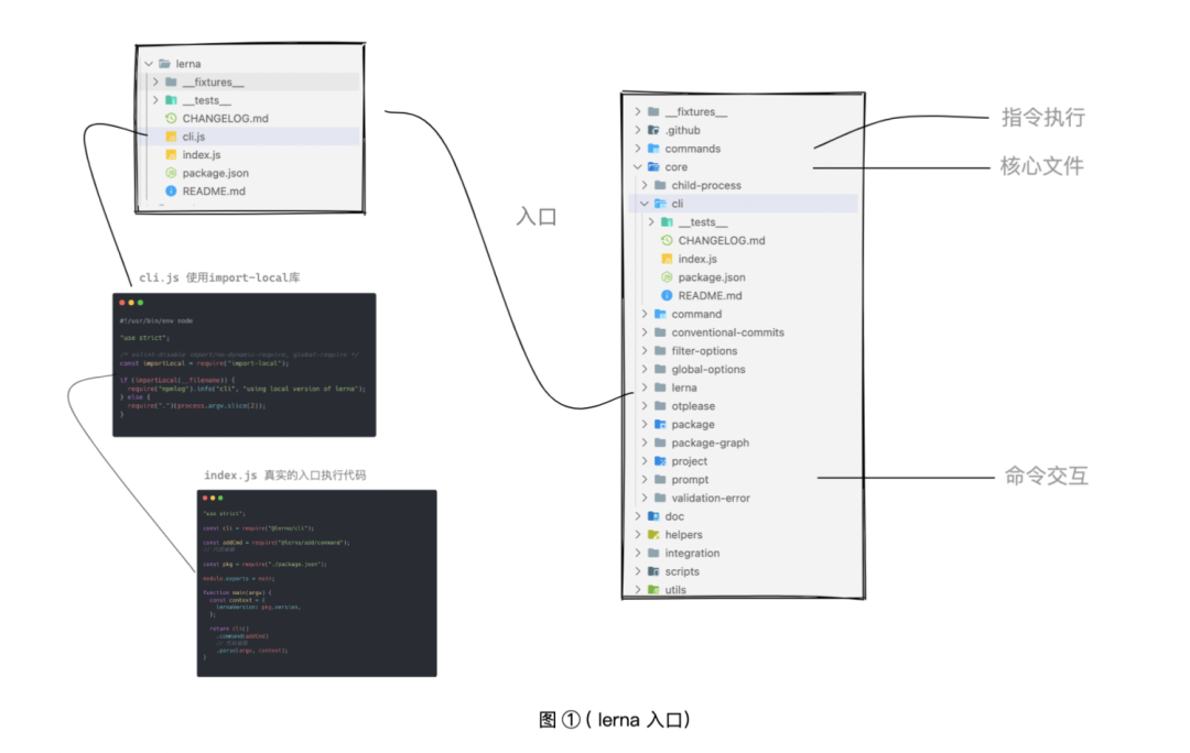 #!/usr/bin/env node"use strict";/* eslint-disable import/no-dynamic-require, global-require */const importLocal = require("import-local");// 判断是否处于本地包文件,下文会介绍if (importLocal(__filename)) { require("npmlog").info("cli", "using local version of lerna");} else {// 进入真实的入口执行代码 require(".")(process.argv.slice(2)); // [node, lerna, 指令]}如图一和代码入口的文件仅执行了一条判断语句 ,其目的是为了当项目的局部环境和全局环境都存在 Lerna 时优先使用局部环境下的 Lerna 代码