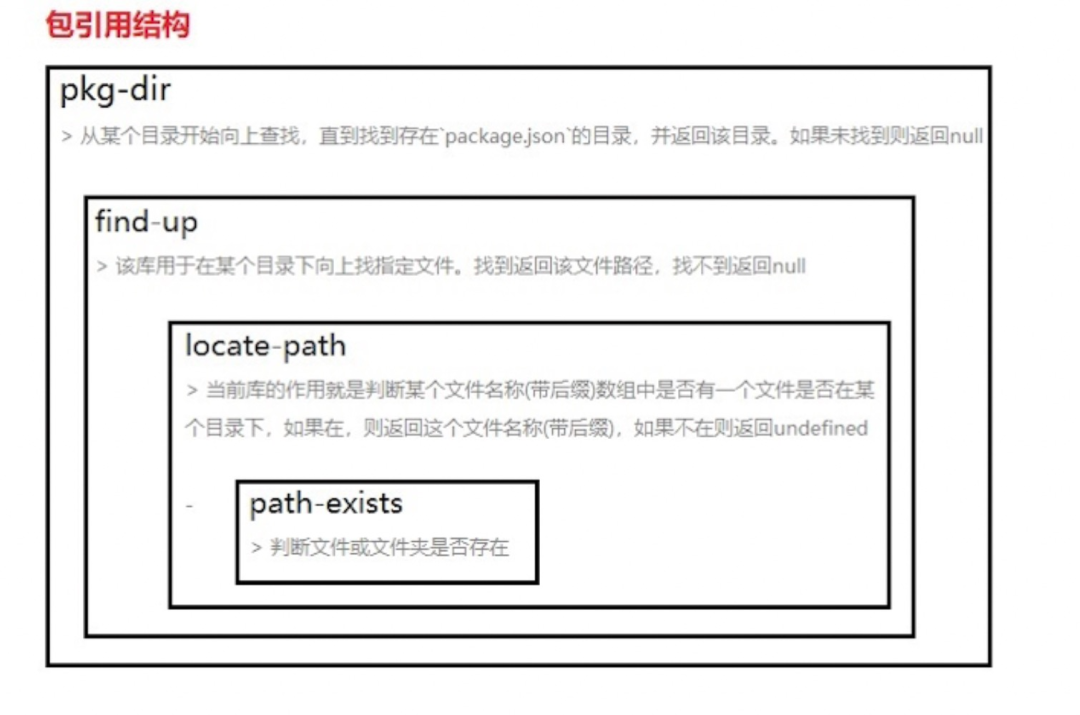 const locatePath = require('locate-path');const stop = Symbol('findUp.stop');module.exports.sync = (name, options = {}) => { let directory = path.resolve(options.cwd || ''); const {root} = path.parse(directory); const paths = [].concat(name); const runMatcher = locateOptions => { if (typeof name !== 'function') { return locatePath.sync(paths, locateOptions); } const foundPath = name(locateOptions.cwd); if (typeof foundPath === 'string') { return locatePath.sync([foundPath], locateOptions); } return foundPath; }; // eslint-disable-next-line no-constant-condition while (true) { const foundPath = runMatcher({...options, cwd: directory}); if (foundPath === stop) { return; } if (foundPath) { return path.resolve(directory, foundPath); } if (directory === root) { return; } directory = path.dirname(directory); }};全局包文件夹全的在当前执行 cwd 向上查找存在 package.json 文件