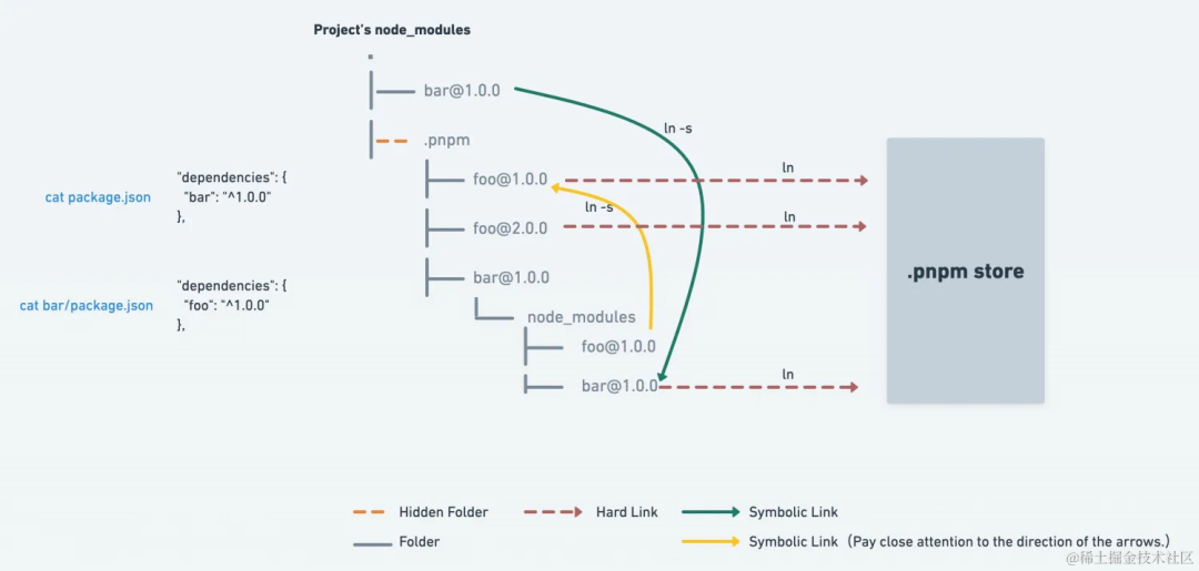 pnpm 通过使用硬链接和符号链接(又称软链接)的方式来避免重复安装以及提高安装效率。硬链接:和原文件共用一个磁盘地址,相当于别名的作用,如果更改其中一个内容,另一个也会跟着改变符号链接(软链接):是一个新的文件,指向原文件路径地址,类似于快捷方式 官网原话: