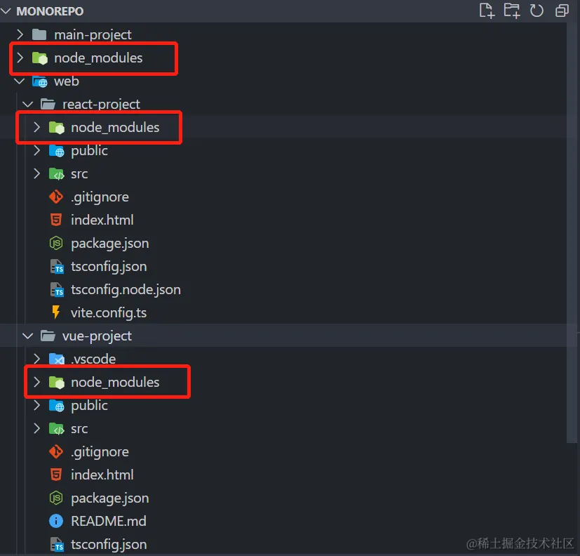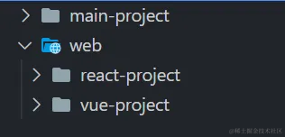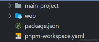 如下结构,我们项目中有一个 main 应用,在 web 文件夹下还有一个 react 应用和 vue 应用,我们可以用 pnpm 对依赖进行统一管理