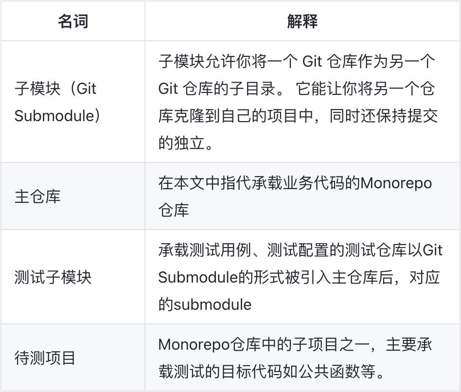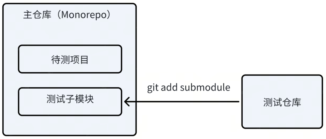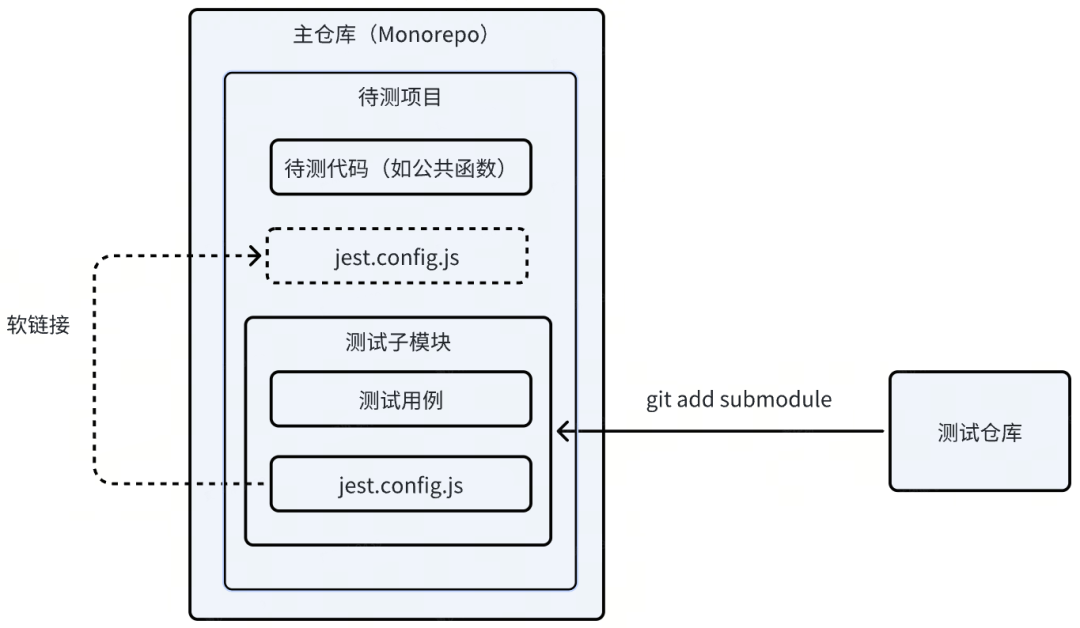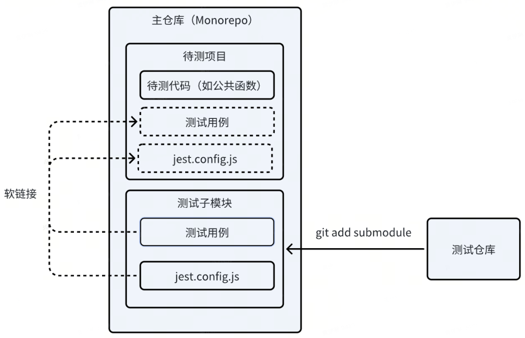 // src/infrastructure/package.json{ "scripts": { // 首次使用需要初始化submodule "test:init": "git submodule update --init && git submodule foreach git checkout origin/master && ln submodule/jest.config.js(子模块中jest配置文件的路径) jest.config.js && eden-test", // 已有子模块后运行单测 "test": "ln submodule/jest.config.js(子模块中jest配置文件的路径) jest.config.js && eden-test" }}方案二:子模块不在待测项目的目录下,需要将子模块中的测试用例和测试配置文件软链到待测项目下,确保测试过程中找到子模块的测试用例