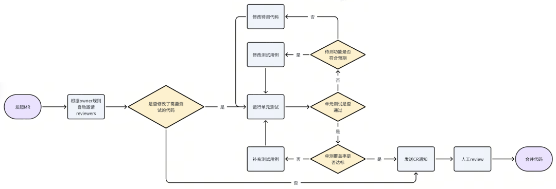 在代码评审阶段,根据代码修改范围邀请评审人、运行单元测试,可以在较大程度上保障代码功能符合预期,降低代码修改带来的质量风险。后续可以尝试与 AI 结合,例如集成大模型自动生成测试用例、review 代码的能力,进一步降低质量保障方案的实现成本,从而提升研发效率。