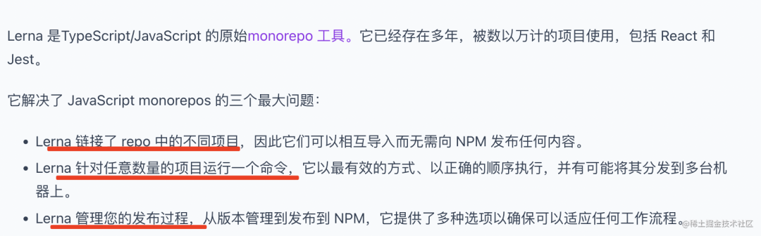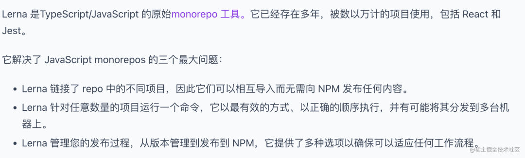 lerna 在文档中说它解决了 3 个 monorepo 最大的问题: