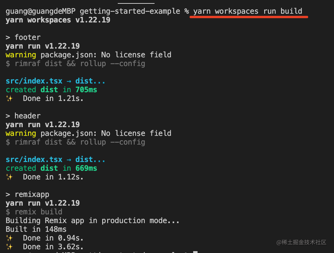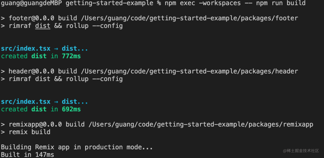 比如 remixapp 依赖了 header 和 footer 包,所以先在 footer 和 header 下执行,再在 remixapp 下执行。