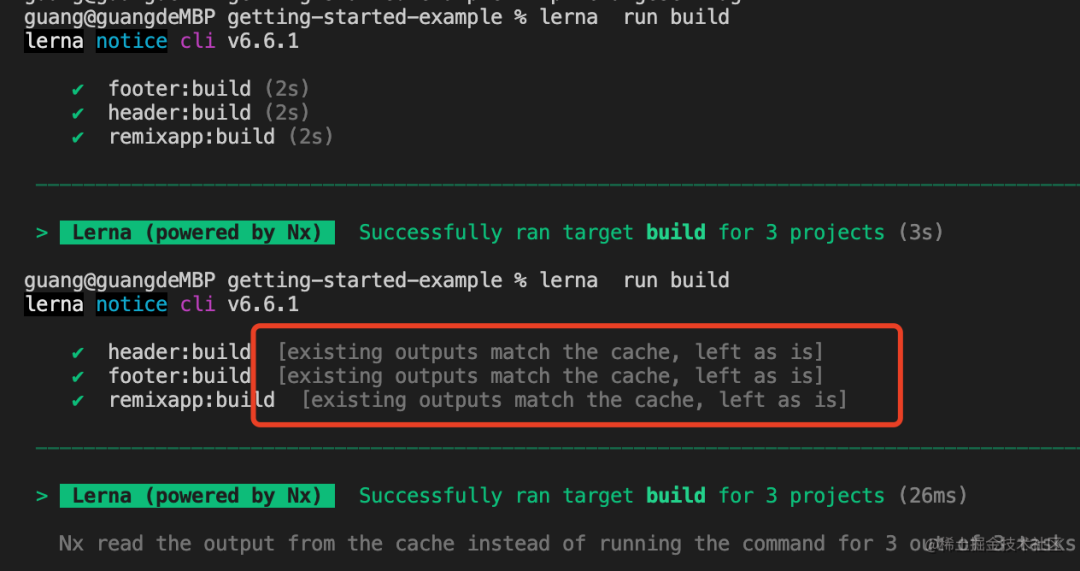 那当再次执行的时候,如果没有变动,lerna 就会直接输出上次的结果,不会重新执行命令。