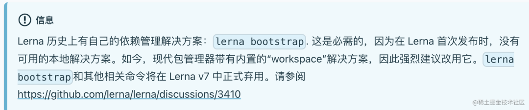 只不过后来 npm、yarn、pnpm 都内置了这个功能,叫做 workspace。就不再需要 lerna 这个 bootstrap 的命令了。