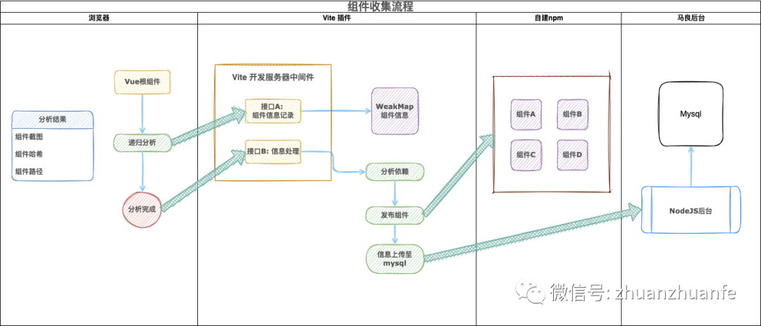 在整个过程中,通过运行时代码提取了组件的特征和截图,通过 Vite 插件获取了 Vue 组件代码以及所有的依赖,并整合数据上传至 Nodejs 服务端,存储到数据库中。最终在马良系统中,用户上传一份 sketch 设计稿,通过对比已有组件与设计稿的相似度,向用户推荐相似的组件。