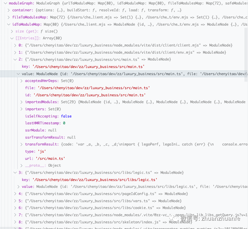 在 Vite 插件中,可以获取到 Vite 内部的模块依赖表,里面是几个 map,可以通过文件路径获取到对应的模块。以图中的