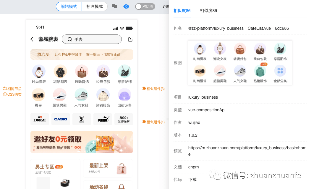 在做完上述的一切后,当前端同学拿到一个新的设计稿,上传到马良系统上,就会和已提取的所有组件特征做一个相似度的匹配,推荐给前端同学使用。在马良系统上的最终形式是: