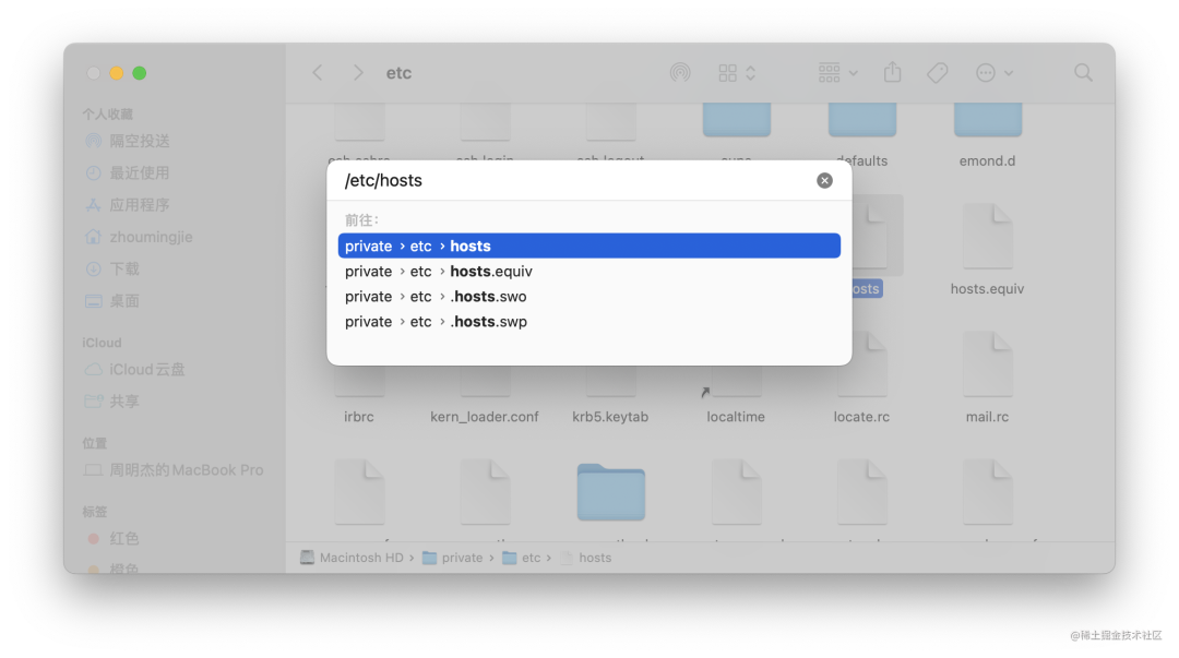 修改 host 文件一般用于开发调试跨域问题,或者因为域名污染导致网站无法访问;finder 中 command + shift + G 打开跳转弹窗,输入 /etc/hosts 就会跳转到 hosts 文件的位置了;
