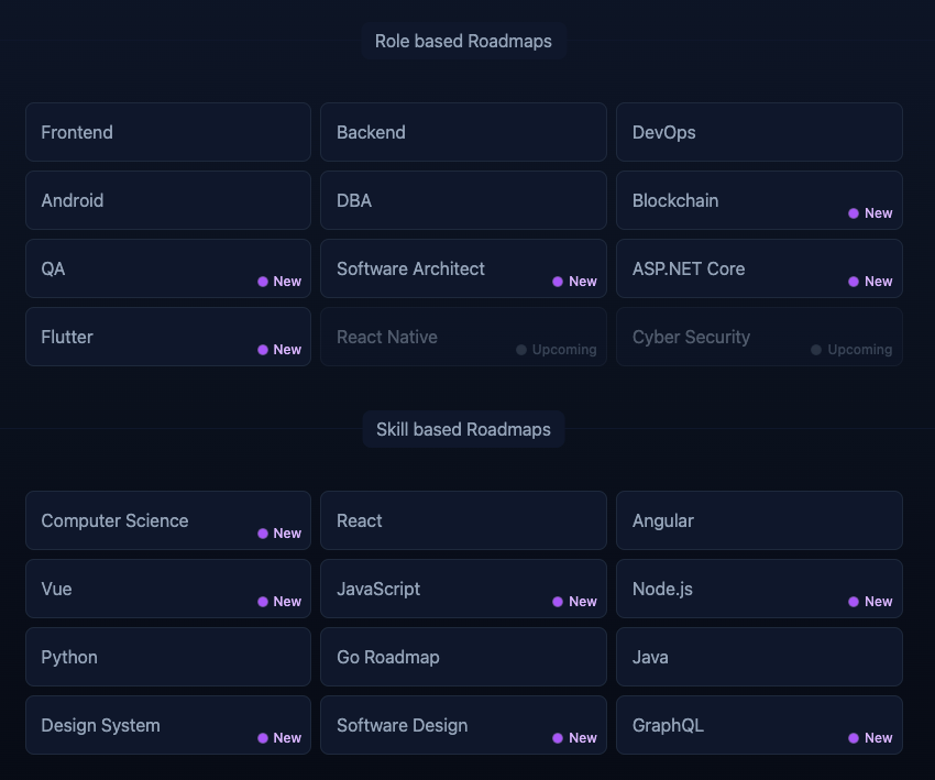 roadmap.sh 是一个不错的网站,是经社区努力,旨在创建各类技术栈的路线图、指南和其他教育内容,以帮助指导开发人员选择路径并指导他们的学习。这些技术路线图可以帮助我们了解一门技术,如果我们正在学习某项技术,则可以循着这个路线图来学习和巩固我们的技术能力。
